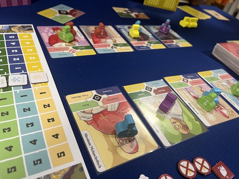 Chaque manche on vérifie d’abord si un cardinal a été élu, dans ce cas c’est la fin de la partie, sinon on repart pour une nouvelle manche, non sans éliminer le cardinal qui a reçu le moins d’influence. Pour qu’un cardinal soit élu et donc que le jeu prenne fin, il faut une majorité particulière qui dépend du nombre de jetons dépensés par les joueurs. On le suit sur notre carte aide de jeu, à mon avis ce système est bien trop tordu et calculatoire pour être amusant. On a passé l’ensemble de la partie à recompter sans cesse, ce qui crée des situations ou l’on va convaincre un joueur de nous aider à faire basculer le vote dans une direction. Cela m’a surtout donné l’impression de faire et défaire.