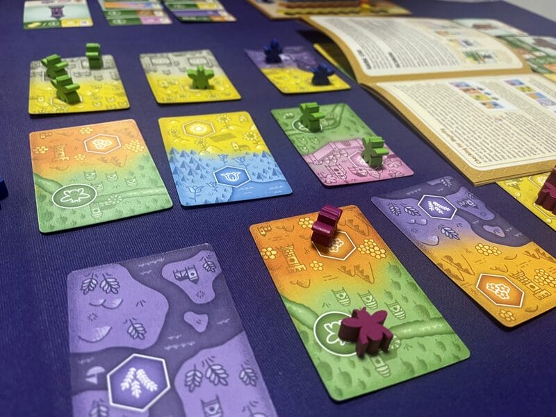 Propolis c’est de la pose d’ouvrières sur des cartes champ pour récolter du pollen de toutes les couleurs et de la construction de moteur. À son tour on place une ou plusieurs ouvrières sur une carte champ pour collecter le pollen, ou bien on dépense notre pollen pour acheter une carte. Ces cartes nous offrent parfois un bonus immédiat, mais aussi une ressource permanente à la “Splendor” et des points de victoire potentiels. Le joueur qui clôture une rangée gagne une ressource Joker, et s’ensuit un calcul de majorité où le gagnant peut récupérer ses abeilles, pratique pour les placer ailleurs ensuite et ne pas perdre de temps.