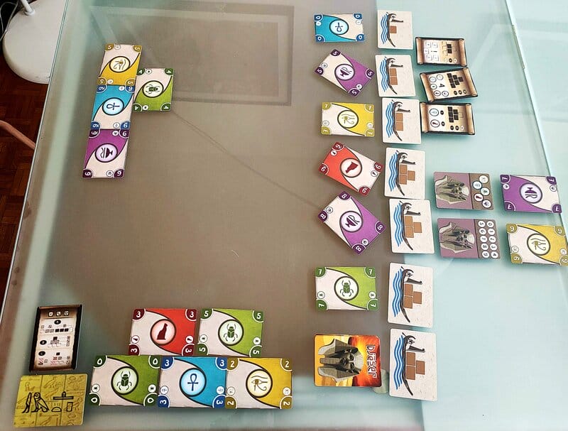 Du fait de la contrainte d’addition/soustraction pour les niveaux supérieurs, le jeu demande un peu de planification, car une fois les trois cartes de la base posées, les possibilités se referment comme un sarcophage sur une momie : toutes les cartes sont uniques, il n’y a donc que 5 cartes pour un chiffre donné. Heureusement, on n’est pas bloqué si un nombre tarde à sortir, on a le droit de casser une pierre de sa pyramide pour repartir sur d’autres chiffres. Les tours de jeu sont rapides et fluides pour des parties d’environ 20-30 min. Toutefois j’ai observé (une fois) que la fin de partie peut parfois s’enliser quand les joueuses bloquent trop celle qui est sur le point de terminer sa pyramide. En effet, ce sont les joueuses qui choisissent la couleur et le chiffre interdit, et comme poser la pierre finale de sa pyramide utilise les 3 actions du tour, celle-ci ne peut rien faire d’autre que changer la couleur interdite, puis se voir rebloquer par une adversaire si une autre carte de cette couleur est présente dans la rivière (ou dans sa main) et ceci sur plusieurs tours. Le jeu permet trop facilement ce blocage et incite à le faire, car achever sa pyramide apporte beaucoup de points. Ce final nous a tous laissé un goût amer, alors que pour le reste, le jeu est plus que sympathique : une mécanique simple mais intéressante, avec la bonne dose (selon moi) de calcul et d’interaction, il aurait juste fallu que le blocage soit moins présent.