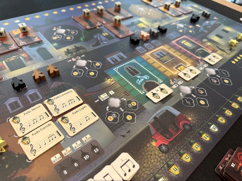 Mécaniquement nous sommes dans un jeu de pose d’ouvriers, avec une mécanique de bump que l’auteur a déjà utilisé dans The Gallerist. ici de manière plus simple, on place son meeple, on réalise l’action désirée, si un joueur prend notre place on a des actions bonus. Cela change la dimension stratégique puisque l’on va essayer de se placer aux endroits convoités pour se ‘faire chasser’. Plusieurs stratégies peuvent exister, remplir son restaurant pour gagner de l’argent et faire évoluer nos musiciens, les envoyer sur la place pour gagner des majorités, payer un critique pour qu’il vienne augmenter le standing de notre établissement, etc. Ou composer des morceaux de Fado.