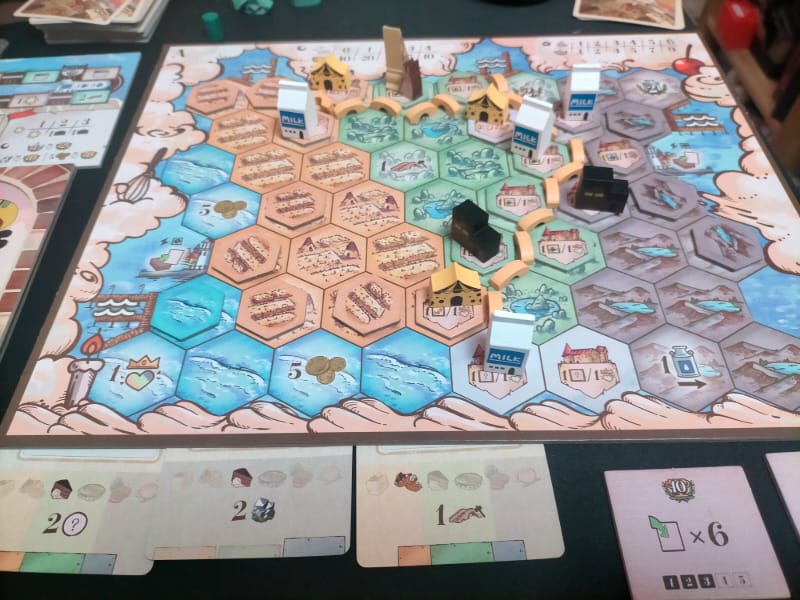 Que nous réserve ce gros jeu tout sucré ? Sweet lands a des aspects très doux, loin des univers parfois austères des jeux qui dépassent un poids de 4 sur BGG. Niveau thème voilà : le Roi Sirop sucré se cherche un successeur, et nous passons l’épreuve. Chacun son terrain, son tableau de ressources et de construction, ses petits lapins, et c’est parti pour les actions qui se succèdent. Pose d’ouvrier/action, gestion de main et de cartes, faire en sorte de garder des cartes pour jouer plus d’actions, avoir la matière pour réaliser ses constructions (pont, ville), et surtout de la monnaie pour payer le coût des cartes qui ont toutes des effets différents qu’on aimera pouvoir jouer.
