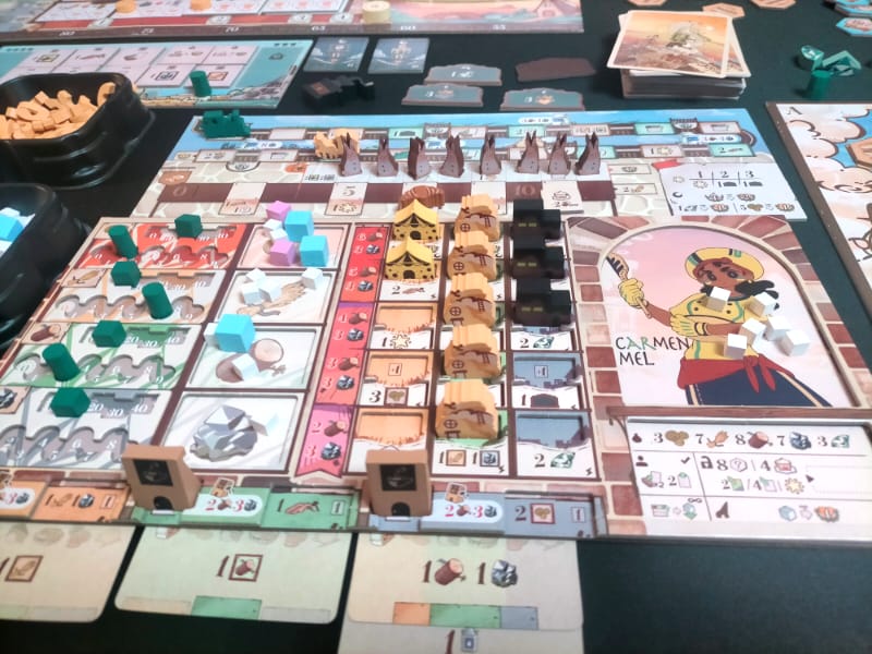 Le développement se passe sur sa carte, construction de ponts (des routes quoi), des bâtiments construits libérant des espaces sur mon plateau de ressources, des villes, des ports à atteindre