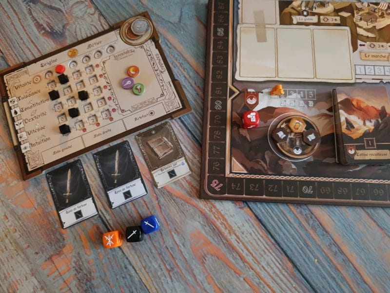 Cinq biomes habités chacun par son dragon nous allèchent par leurs trésors. Bon évidemment pour les choper va falloir pougner des monstres. Les combats se font à coup de dés et après chaque victoire je décide si je continue ou si je m’arrête. Si je survis, je repars avec autant de récompenses que de monstres vaincus. Dans le cas contraire, je perds tous les gains de mon expédition en cours :(. Avec mes gains je vais pouvoir améliorer mon héros (caractéristiques, armes, objets). Les mécaniques du jeu amène beaucoup d’interactions entre les joueurs et une belle immersion renforcée par la qualité de l’édition. Sur ce point d’ailleurs je tiens à saluer le format du jeu : le matériel est suffisamment compact pour tenir sur une table sans sortir les rallonges ^^.