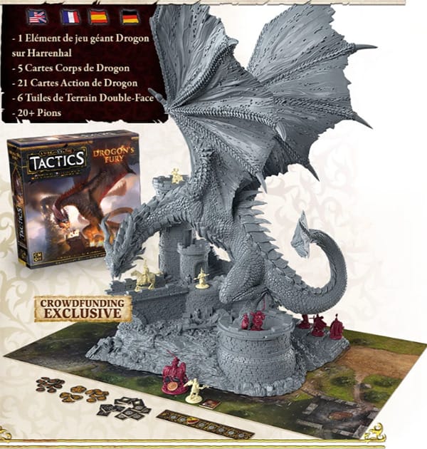 CMON lance ce nouvel opus via une campagne Gamefound consistant en deux offres. La première est une introduction qui place un joueur aux commandes du prince Rhaegar Targaryan et de ses troupes royales, tandis que son adversaire incarne le rebelle Robert Baratheon et une coalition qui espèrent briser le joug des dragonniers (la Bataille du Trident, ça vous parle ?). L’autre est une exclusivité du crowdfunding qui se concentre sur l’ami Drogon, le plus grand dragon de Daenerys (CMON se fait plaisir façon Galactus).