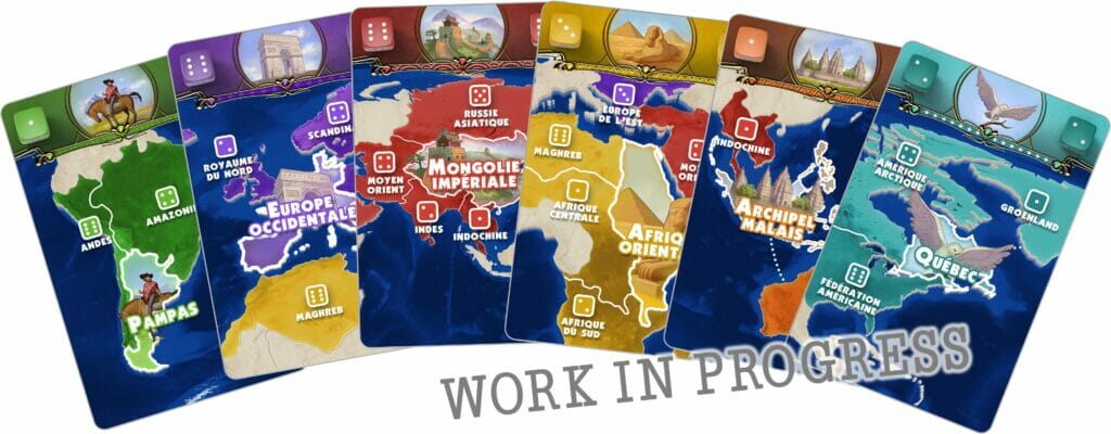 Pendant mon enfance j’adorais un jeu de plateau de conquêtes du monde bien connu. J’avais envie de retrouver certaines sensations de ces parties, mais personnellement je le trouvais trop long pour un jeu au final assez hasardeux. Je peux apprécier le hasard, quand on a la possibilité de s’y adapter et aussi quand les parties sont courtes. Au pire, on perd une partie, et en on en enchaîne une autre où la chance aura tourné. J’aime aussi les jeux de cartes, car ils sont plus faciles à emporter partout avec soi. Pendant mes vacances d’été 2019 j’ai commencé à diviser le monde en 30 régions, j’ai créé des cartes avec, et le jeu était né.