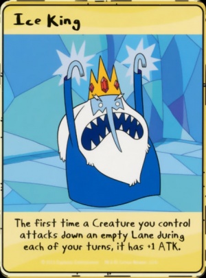 Pour en revenir au contenu de la boîte, il y a assez peu de choses à dire. Le matériel est de qualité très moyenne. Habitués aux DC Comics Deck-Building, cette version du jeu Adventure Time : Card Wars intègre deux cartes géantes, de la même taille que celles des héros ou méchants à la DC. La boîte dont je vais parler est celle qui présente la bagarre entre le Ice King et Marceline la reine vampire. Les deux cartes de grande taille donnent aux personnages un pouvoir spécial, qui leur offrent un souffle relativement intéressant, quoique déjà représenté sur certaines cartes créatures. Je reviendrai sur ce point un peu plus tard.