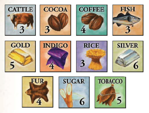 D’autre part, être le premier présent avec au moins 3 colons dans une région permettra l’acquisition de la tuile marchandise de cette région qui indiquera son type et la quantité de tuiles similaires existantes dans le jeu (exemple : le sucre disponible en 6 exemplaires).