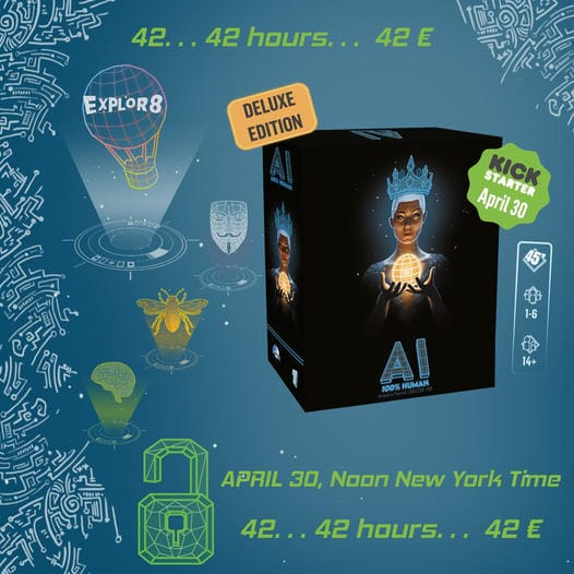 IA 100% Human est un jeu de draft brûle-neurones qui peut réunir jusqu’à 6 humains (on n’a pas encore réussi à remplacer les êtres humains pour jouer) il arrive sur kickstarter le mardi 30 avril 2024 et il est illustré par Vudu (oui un vrai humain, qui était derrière Aquarena chez GaG) le tout chapeauté par Explor8 (Federation, Big monster, Robotrick…).