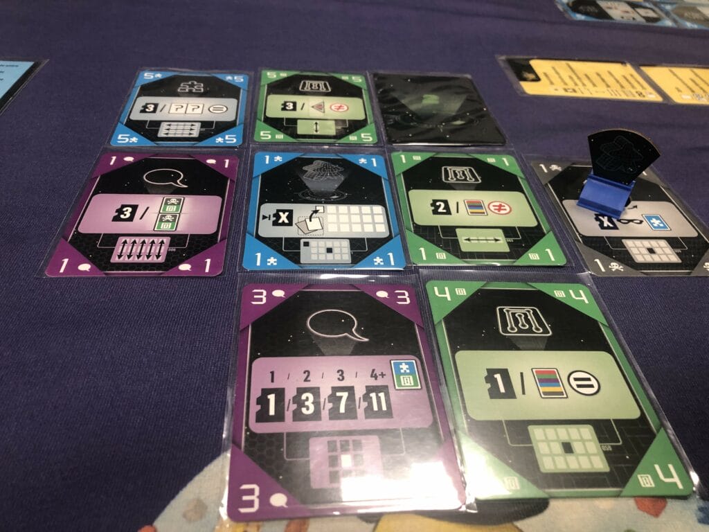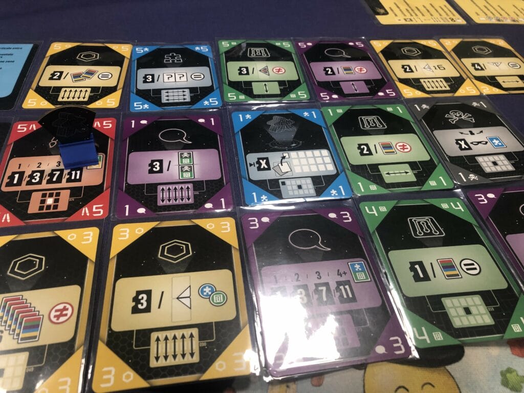 La carte que l’on joue va se placer de manière adjacente à une carte déjà placée, donc au début, autour de notre carte IA de départ, qui nous donne des points de victoire immédiats selon une condition, cela peut être la couleur, la valeur, de la collection, ou d’autres signes cabalistiques ^^. Parfois vous scorez dans tout votre tableau, d’autres fois juste la ligne ou la colonne où votre carte est placée.