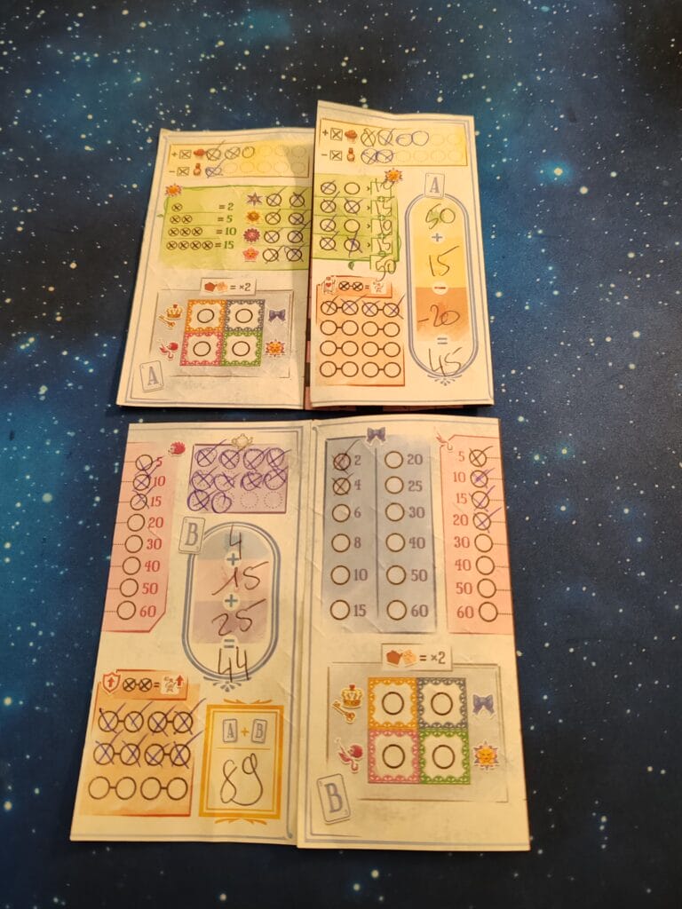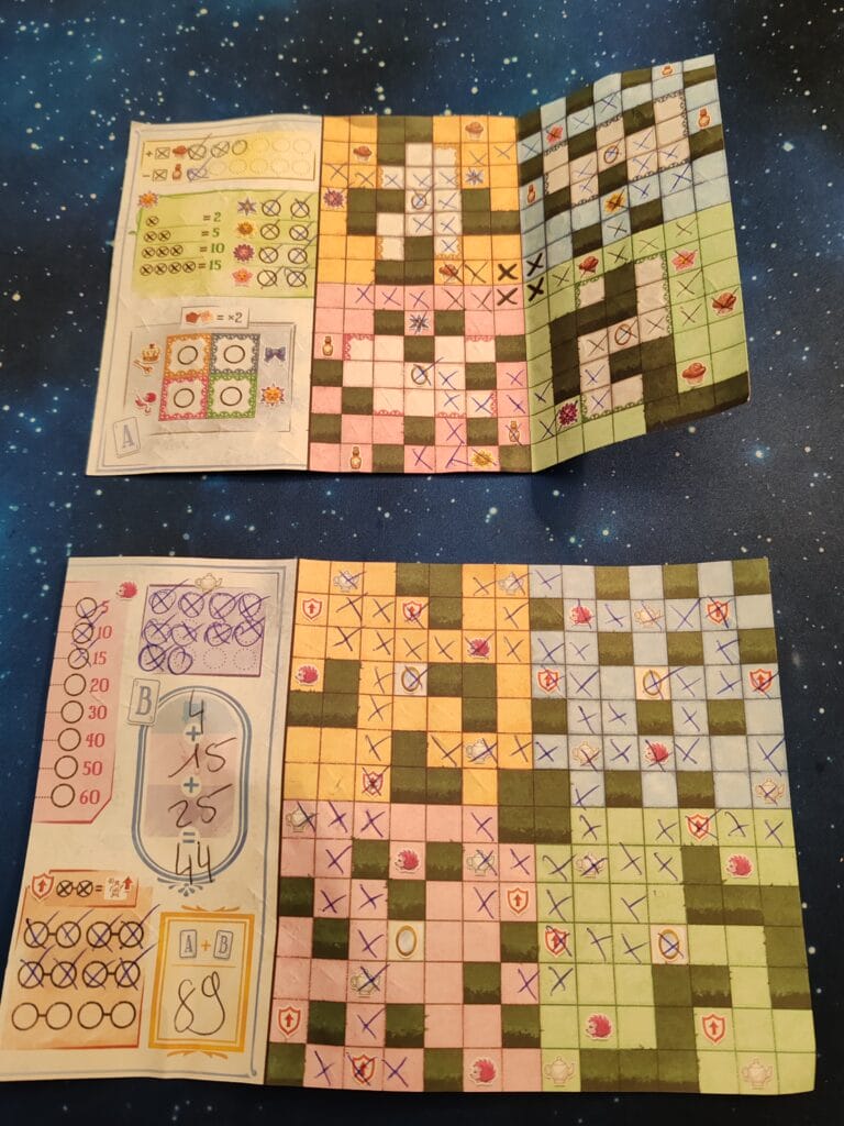 De nombreuses petites originalités renforcent ces interactions : potions et gâteaux sont partagés, la lutte pour être le premier joueur est très disputée (il choisira les formes à cocher), la récupération d’une clé sur la feuille A peut débloquer une serrure sur la feuille B, et les gardes font office de malus sur la feuille A mais sont renvoyés sur la feuille B de l’équipe adverse. Les terrasses prennent également une dimension stratégique puisqu’elles doublent tous les points, tandis qu’une course aux fleurs généreuse et joyeuse contribue à transformer ce flip-and-write en une expérience conviviale et plaisante, mêlant réflexion de groupe et confrontation directe.