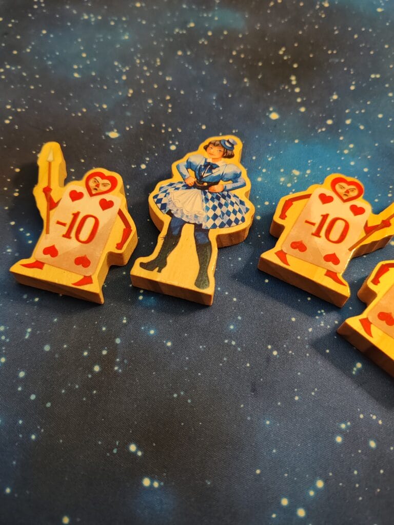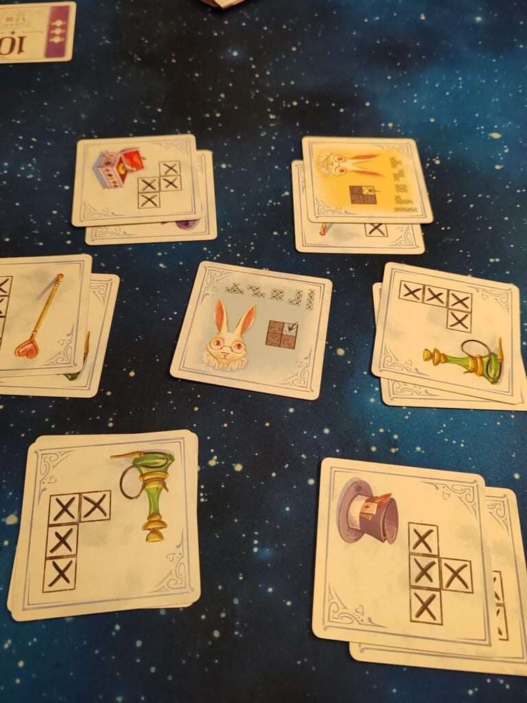 En tant que professeur de mathématiques qu’était Lewis Carroll, j’imagine qu’il aurait trouvé les mécaniques de cet Alice brillantes. L’objectif est de remplir ses grilles, côté recto et verso. Pour cela, il s’agira d’y reproduire les formes révélées sur les cartes Tea Party : des polyominos. Les joueurs en dévoilent une à la fois ; celle-ci donne des indications sur les formes possibles à placer. Plusieurs contraintes : les formes doivent être placées entièrement et toucher au moins une case déjà cochée, ne doivent jamais recouvrir de buissons et peuvent être tournées ou mises en miroir. Si une forme ne peut pas être placée, on coche une seule case adjacente à une case déjà cochée. Si un lapin se trouve sur la carte, il donnera une indication sur l’endroit où la forme doit obligatoirement être placée.