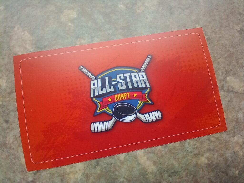 L’arène attend ses combattants. Il faut maintenant réunir son équipe. Elle est à composer parmi une main de 6 hockeyeurs que chacun se voit remettre en début de manche. Si le jeu se nomme All-Star Draft, c’est qu’il y en a un. Ce jeu est essentiellement composé de cartes, on en prend une, on passe le paquet à la voisine etc. On écarte un hockeyeur sur son banc, puis on constitue notre équipe de 5 cartes. Pour en imposer, il faut que nos p’tits gars se partagent un attribut commun : la même valeur, la même couleur ou le même symbole.