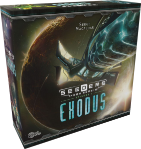 Seeders from sereis episode 1 : Exodus (que j’appellerai Seeders par praticité) vise un public plus joueur, plus aguerri. Exodus, son premier chapitre, est un mélange de draft, de pose d’ouvriers avec majorité, et de développement avec des combos de cartes. Sha-Man et moi avons eu le loisir de jouer avec l’auteur (Serge Macasdar) au second volet de Seeders, qui s’intitule pour l’instant Karman Swap.