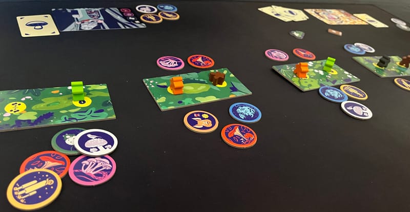 Dans la phase suivante, on se place sur les tuiles forêts pour ramasser des champignons avec la mécanique du « Split you Choose » ou « je partage, tu choisis » en français. Chaque tuile comprend quatre champignons (première manche). Le second qui s’y place devra effectuer un partage en deux lots plus ou moins équitables. Suite à quoi le premier devra en choisir un, laissant l’autre à son adversaire. Cette mécanique est utilisée pour créer des gros dilemmes pour les deux joueurs. Qu’est-ce que je prends, mais aussi qu’est-ce que je laisse.