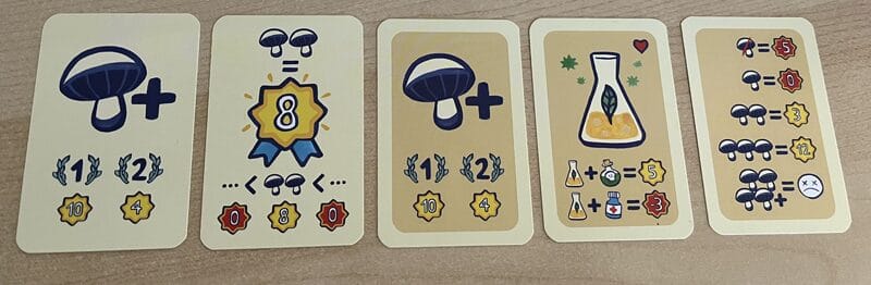 Je vous ai présenté le jeu avec les cartes indice recommandées pour les premières parties, mais vous pouvez varier les plaisirs et ajouter des champignons un peu plus complexes à gérer. Après 7 parties je n’ai pas eu ce plaisir, parce que je le fais essentiellement découvrir à de nouveaux joueurs. Il y a des décomptes particuliers dans la plupart des cas. Par exemple, vous obtenez 8 points si vous avez deux champignons de ce type, mais 0 si vous en avez plus ou moins. Ou bien entre – 5 points et 3 points si vous en avez 1, 2 ou 3, mais, avec 4, vous avez fait une indigestion, paix à votre âme.