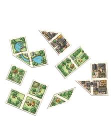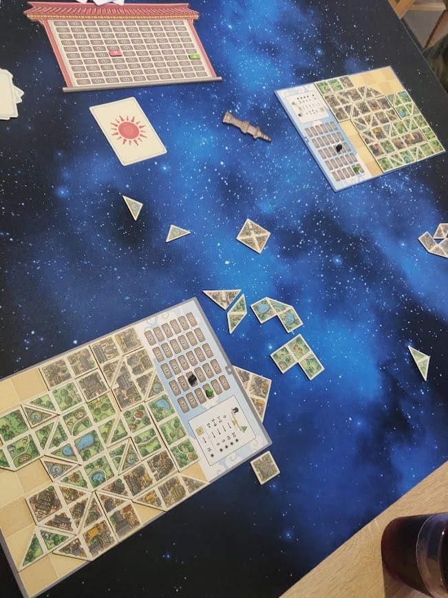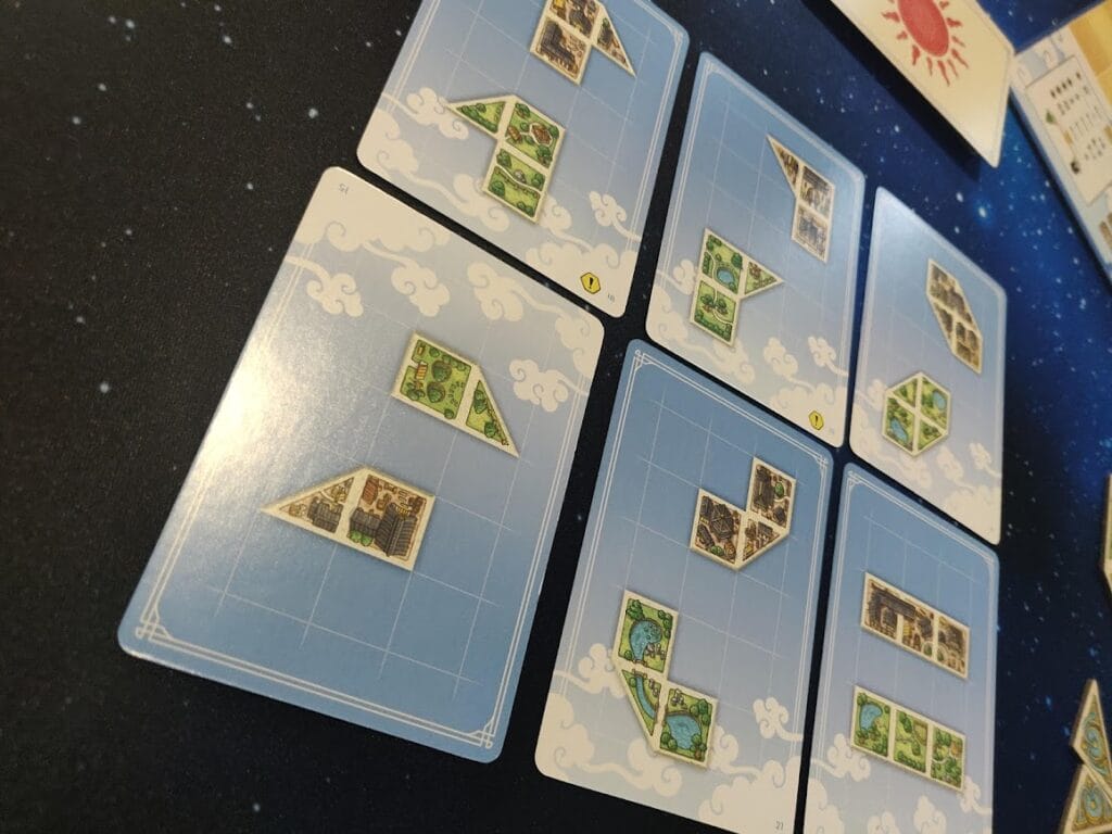 Ce sont donc des pièces alternant triangle et carré qui s’étalent sous nos yeux. Chaque joueur a son propre set de pièces, mais tous les joueurs poseront les mêmes pièces et au même rythme. Au cours des différentes manches du jeu, nous serons amenés à poser toutes nos pièces, en fonction du tirage des cartes, pour construire notre propre cité.