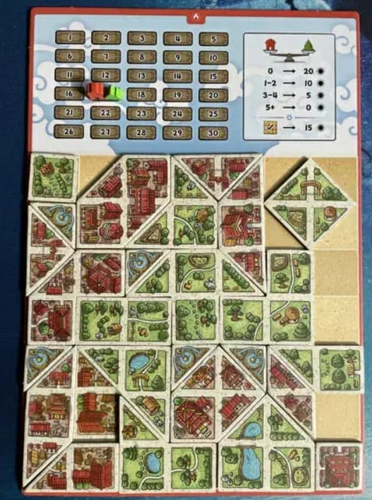 Au terme des 6 manches de jeu, le score cumulé au cours du jeu se verra bonifié si le joueur a réussi à garder un équilibre entre les jardins et les bâtiments. Et un bonus spécial si on a placé toutes les pièces, qui couvriront alors la surface de notre plateau joueur.