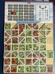 Après chaque manche, il faut calculer l’équilibre entre les carrés jardin et bâtiment de notre plateau joueur. Si c’est assez simple sur les 2-3 premières manches, cette action de comptage devient vite fastidieuse dès que notre plateau se remplit.