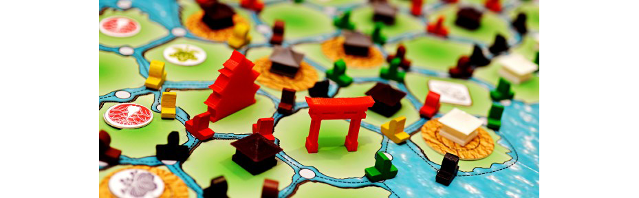 Autre point commun avec Five Tribes, le type d’édition bien sûr, avec ses gros éléments colorés en 3D et l’exotisme du thème à l’horizon : on quitte les sultanats de Naqala pour apprécier les torri d’un ancien royaume japonais, le pays du Yamataï. Voyage voyaage.