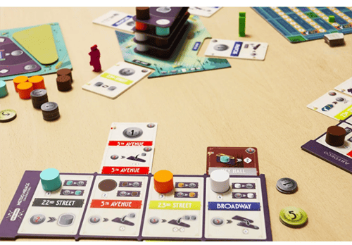 Flatiron s’adresse à un public dès 12 ans pour des parties d’environ 45 minutes (édité par Ludonova). Illustrations par le grand Weberson Santiago (L’auberge sanglante, Sail, La Famiglia, Kelp…).