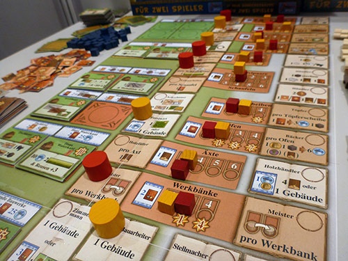 Voici donc un jeu pour deux joueurs uniquement où l’on aura à drainer la terre avec des digues et où l’on devra veiller à la croissance de notre élevage, développer l’artisanat et penser à la construction de bâtiments appropriés, le tout avec un mécanisme de pose d’ouvriers si cher à l’auteur.