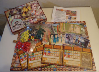 >> L’Elixir peut être produit au choix à la place d’un objet, il permettra ensuite d’être employé pour remplacer n’importe quelle autre ressource du jeu, et vaudra un point pour le décompte final. L’Elixir se crée en convertissant deux ressources différentes. Et si la transformation est parfaitement réussie, vous gagnez 1 point de victoire en bonus, c’est pas beau la vie au pays d’Alchimia ?