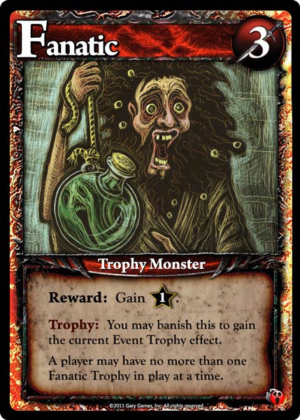 Le Fanatique est un nouveau monstre disponible en permanence, comme le Cultiste. Une fois vaincu, nous pouvons le garder dans notre zone de jeu comme un Trophée et le bannir pour profiter du Trophée d’événement de l’événement en cours. On ne peut avoir qu’un fanatique devant nous à la fois.