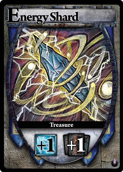 On découvre dans RoV un nouveau type de carte : « Treasure » (Trésor) représentées exclusivement par des « Energy Shard » (Éclat d’Énergie). On débute la partie avec deux de ces cartes en plus des cartes de départ habituelles de notre deck. Quand elles sont jouées, elles permettent de piocher immédiatement une nouvelle carte et nous font gagner une énergie qui est un nouveau type de ressource permettant d’activer des effets complémentaires sur certaines cartes si l’on atteint le nombre d’énergie nécessaire durant le tour (la carte est alors « Energize »/ Énergisée). Lorsque qu’une carte Trésor entre dans la ligne centrale, on la recouvre immédiatement par la carte suivante de la pioche. Ainsi, elles se gagnent en tuant ou en acquérant la carte qui se trouve au-dessus (il peut bien sûr y avoir plusieurs Trésors en-dessous d’une même carte).