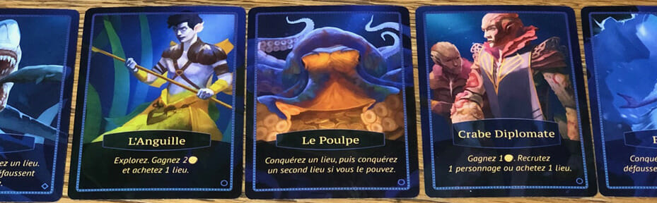 Pour acheter de nouvelles cartes, on aura besoin d’une des deux ressources : de l’or pour les personnages et les lieux, et également des tridents comme façon alternative de récupérer les lieux. Jusque là, rien de surprenant. Mais ces ressources, si elles vous sont parfois fournies en petite quantité par votre carte personnage, ne seront en général pas suffisantes pour acheter tout ce que vous souhaitez. De plus, elles ne sont pas persistantes d’un tour à l’autre : si vous ne les utilisez pas, elles sont perdues. Il va donc falloir les trouver ailleurs.