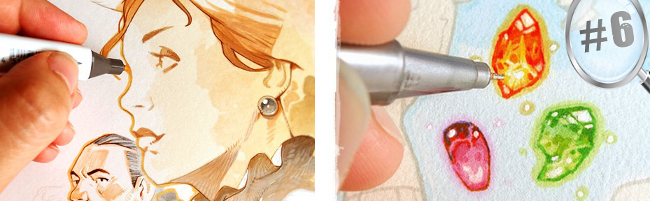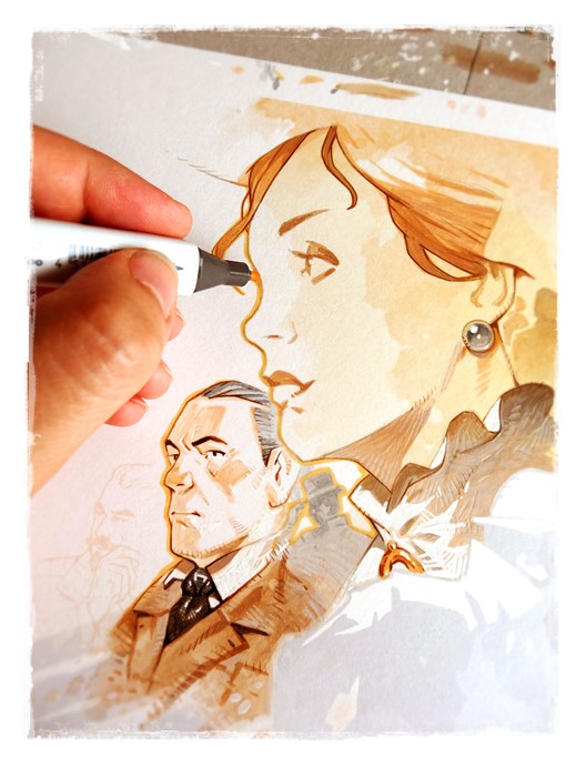 « La réalisation de l’illustration s’est déroulée sensiblement comme celle de Sherlock 13 avec une première étape de crayonnés, puis montage numérique pour revenir sur le papier et la mise en couleurs aux pinceaux. »