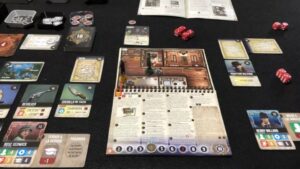 Chaque lieu est une scène que vous allez explorer : l’entrée d’un hôtel, des souterrains, un cimetière, … Un lieu est divisé en cases et, à chaque tour, vous aurez deux actions à effectuer parmi se déplacer, explorer, parler…