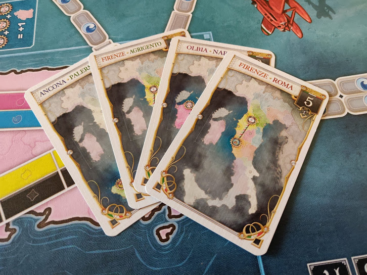 Un autre système de gain de points de victoire se rajoute sur ce plateau via le passage de ses voies ferrées par le maximum de régions italiennes. Plus une même continuité de wagons traverse de régions italiennes, plus cela rapportera de points en fin de partie.