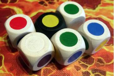Tout d’abord, lancez les 5 dés blancs et le dé noir. Puis, vous avez le choix entre trois actions :