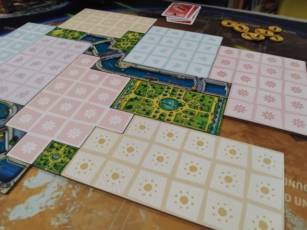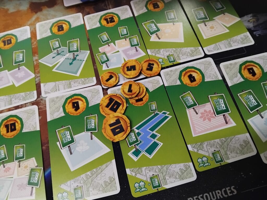 L’argent ayant valeur de points de victoire, dépenser c’est perdre doublement. C’est aussi une obligation si on veut vraiment se placer sur un endroit précis, avant les autres, mais cela en vaut-il la chandelle ? Payer 6 pièces pour gagner 7 points… à réfléchir. Le jeu est sujet au hasard, mais là aussi, cela reste léger, rien de violent. Le hasard des bâtiments que l’on a en main via les cartes a-t-il une importance ? Chaque bâtiment étant en double, on a donc quatre tailles différentes disponibles (de une à 4 cases de superficie), on a ainsi peu de chance de manquer de matière. Le hasard des cartes contraintes qui vous indique sur quel terrain construire, est un peu plus gênant par moment, surtout sur la fin quand la place est moindre. Dans certaines parties, il arrive aussi que le dernier bâtiment ne trouve pas sa place sur le plateau.