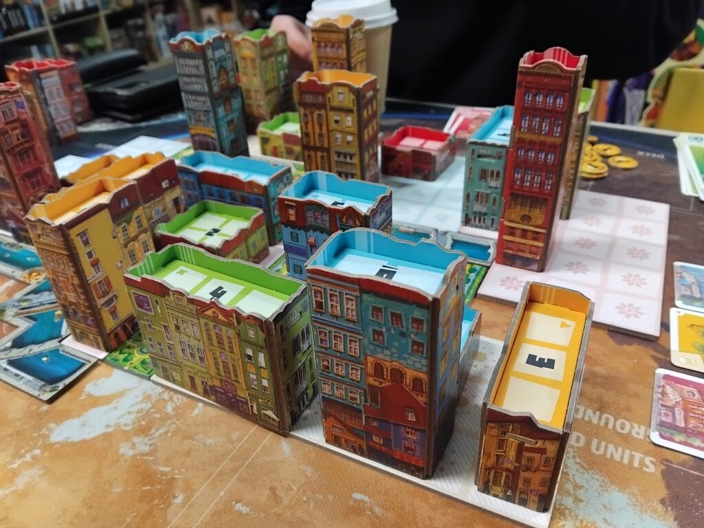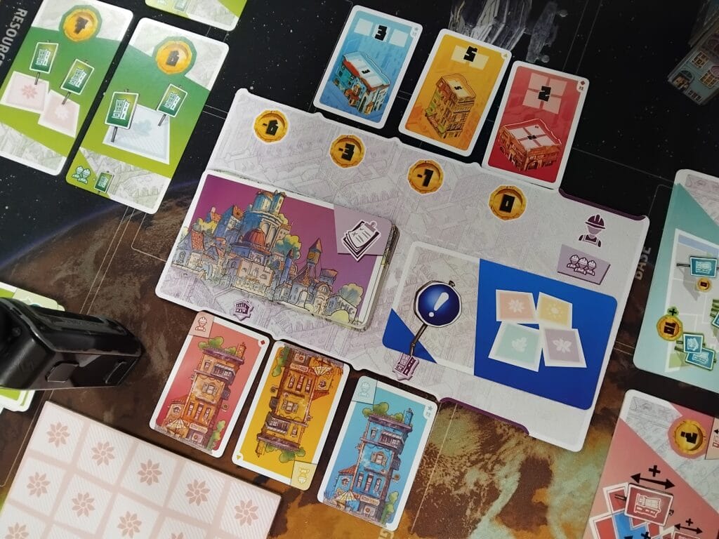 On a l’impression qu’il y a mille choses à faire et qu’il faut être partout à la fois. C’est un peu vrai mais pas tant que cela. La contrainte des quartiers donne la direction et aiguille les architectes. Un peu de jugeote, d’observation sur la pose des immeubles voisins, leur avancée sur les contrats et vous êtes au cœur de la partie. Cela rend le jeu interactif pour prendre les places, valider les contrats… À trois, le dernier doit placer un bâtiment neutre, permettant de modifier un peu plus le plan urbain. C’est un point appréciable, celui de ne pas être un solo multijoueur comme on en voit tant.