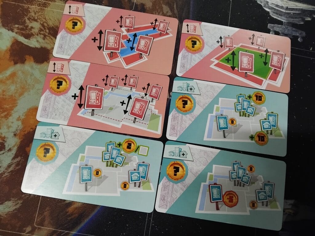 Hasard encore, à chaque tour, la carte Contrainte indique sur quel type de quartier placer son immeuble (cases hachurées, bleues, près d’un parc…). Cela peut différer notre stratégie, il faut s’accommoder au mieux de cette contrainte, qu’elle serve de toute façon.