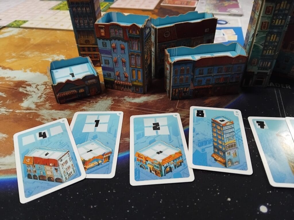 Le hasard, initié ici par les règles, existe mais dans une moindre mesure. Sur nos 8 cartes bâtiments, seules 3 sont disponibles à chaque tour. C’est déjà une première contrainte: faire avec ce que l’on a. Les bâtiments sont de forme et de hauteur différentes. La tour de 8 est la plus haute et se place sur une case, tandis que la 1 est la plus basse et occupe 4 cases. Ne pas réellement choisir ses immeubles n’est pas très pénalisant, sauf sur la fin où les places sont parfois plus exiguës.