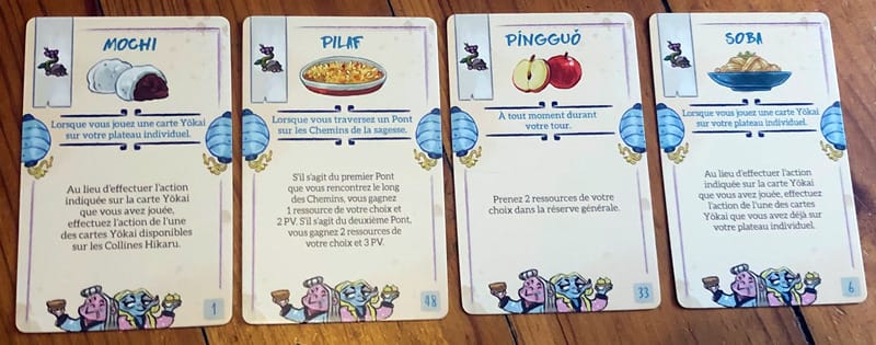 Commençons par les cartes qui vont pouvoir twister le jeu, nous débutons avec deux d’entre elles et nous pouvons en récupérer dans certaines conditions. Ces cartes vont ajouter des moyens de réaliser les actions autrement, par exemple avec Soba je peux refaire l’action d’une de mes cartes placée sur mon plateau au lieu de celle que je viens de jouer. Avec Mochi, je peux même réaliser l’action d’une carte présente sur la colline au lieu de ma carte. D’autres permettent des bonus plus ou moins forts, citons Pilaf qui vous fait gagner point et ressources si vous traversez la rue (non) le pont.