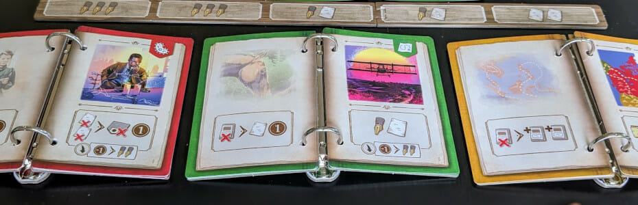 Parmi cette offre pléthorique, certaines actions m’ont parues dispensables, ou pas assez fortes. Par exemple fermer un registre pour le « rembobiner » et gagner un petit bénéfice par page. On gagne grosso modo autant en activant une page. L’action est censée réinitialiser la séquence de cartes sur une registre avant de pouvoir activer de nouveau vos pages, mais pour être franc, il faudrait y passer de nombreux tours pour que cela soit rentable, c’est du luxe. Je ne l’utilise personnellement jamais. Idem pour l’action qui ne fait tourner qu’une page de chacun de nos livres (et gagner un micro bénéfice). C’est peu pour un tour de jeu, il ne se passe rien. Les actions auraient peut-être mérité d’être fusionnées, ou repensées, pour être moins nombreuses et surtout plus claquantes !