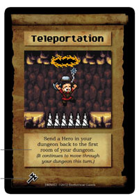 La topologie des cartes salles est assez simple, on a la valeur de dégâts infligés à son entrée, son type « monstre » ou « piège », un effet « spécial » qu’elle produit qui peut être assez varié (certains augmentent les dégâts, d’autres font reculer les héros et certains permettent de piocher des salles ou sorts si l’on tue des héros à l’intérieur) et enfin un certain nombre de symboles héros.