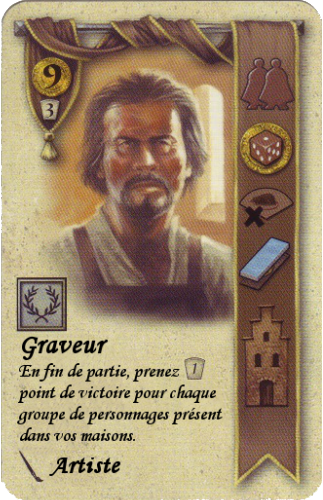 Il s’agit de 40 nouvelles cartes personnages, réparties dans les 5 couleurs du jeu. Plus exactement, 39 nouveaux personnages, car le Graveur, décrié pour son pouvoir déséquilibré, est fourni en version revue et corrigée. Son prix a été baissé d’un cran, mais il ne rapporte plus qu’1PV par groupe de personnage au lieu de 2PV. Saluons ici la bonne foi de l’éditeur : reconnaître le problème et prendre soin d’y pallier est une attention louable.