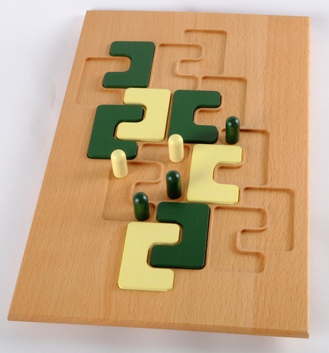 « Que faisons-nous ce soir Cortex ? La même chose que tous les soirs Minus, tenter de conquérir le monde ! ». Et pour cela, l’éditeur Clemens Gerhards a mis les petits plats dans les grands en proposant un luxueux plateau de jeu en bois massif (du hêtre !). Sur celui-ci sont gravés des emplacements délimitant l’espace de l’affrontement ludique (malheureusement aucun petit « picot » pour maintenir les pions, ceci pour améliorer le rendu visuel), et pouvant accueillir des morceaux de bois en forme de C (aucun rapport avec le nom du jeu bien entendu) aux couleurs blanches et vertes. Un petit sachet en tissu contenant des pions (également blancs et verts : comme quoi, la vie est bien faite) trône également dans la boîte.