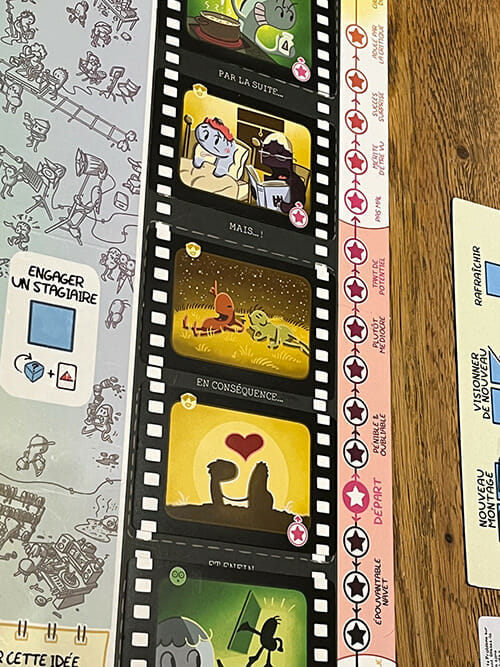 Pour sortir votre œuvre, le jeu balaie les principales étapes de la production d’un film, telles que le choix d’un scénario, le story-board, la conception des décors, le tournage en lui-même, le montage… Vous garderez un œil fixé sur votre budget et sur le calendrier car ni l’un ni l’autre ne doit être dépassé (sans quoi, game over !), et inlassablement (ou pas), vous affronterez tous les contretemps possibles et imaginables via les cartes problèmes qui surgissent de manière métronomique (au début du tour de chaque joueur). L’ingé son qui a oublié de lancer l’enregistrement, la star du film qui pète le budget avec son envie de limousine-jacuzzi incrustée de diamants, la productrice qui insiste pour que sa nièce ait un rôle dans le film, l’équipe VFX qui n’est pas trop au taquet à cause des sushis burritos pas ultra digestes, la liste des complications est aussi drôle que longue. En tout cas, elles font leur petit effet surprise quand on découvre le jeu.