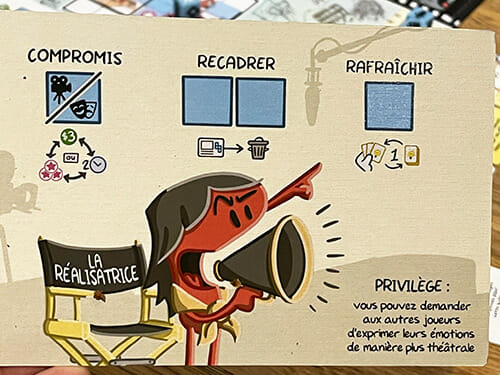Pour moi, l’une des plus brillantes idées est la réunion d’équipe de prod. Nous avons tous trois cartes idées en main, potentiellement capables de donner un sacré coup de pouce au tournage, voire de nous sortir d’un mauvais pas. Mais pour pouvoir en jouer ne serait-ce qu’une, il faudra déjà décider de faire une réunion (c’est une des actions possibles et cela coûte un dé), histoire d’en parler en comité. Selon les problèmes auxquels vous êtes confrontés à cet instant T, vous allez devoir choisir une carte de votre main, et la pitcher aux autres, voire tenter de les convaincre que c’est la seule bonne chose à faire. Peut-être qu’elle est effectivement très utile, mais pour plus tard, on peut alors décider de la mettre de côté, mais ça sera plus coûteux de l’activer.