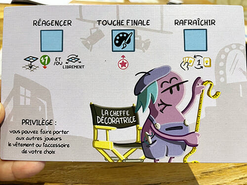 Autre détail assez fun, vous pouvez jouer de votre personnage pour imposer un petit délire – aussi inutile qu’amusant – à tous les joueurs, ce qui amène Ça tourne à regarder du côté party game de la chose. Genre, le chef décorateur peut demander aux autres de porter un vêtement ou un accessoire, selon sa guise. La réalisatrice peut exiger que l’on s’exprime de manière plus théâtrale. La star appellera les autres au silence, etc. Ça ne change pas l’issue du jeu, mais nous ramène à sa matière première de façon légère.