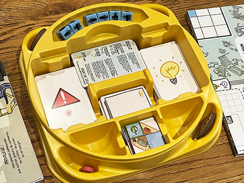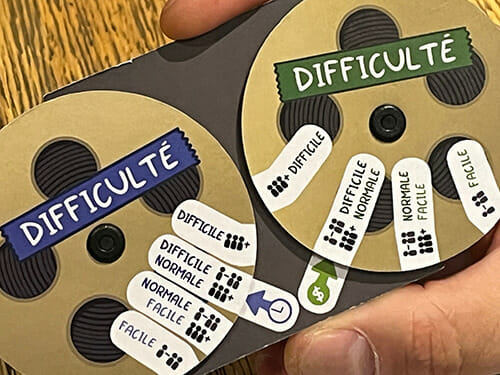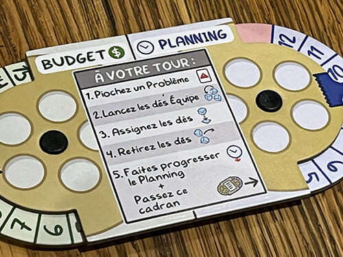 L’auteur est illustrateur, ça se voit, il a une vision originale de son jeu, c’est indubitable. Mention spéciale à la petite double-roue qui permet à la fois de gérer budget et planning, de régler la difficulté en prenant en considération le nombre de joueurs, et sert d’aide de jeu ; elle pourrait presque servir le café que ça ne nous surprendrait pas.