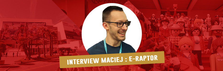 Nous voici sur le stand de E Raptor, où Maciej nous parle de leurs accessoires pour jeux de société (tours à dés, distributeurs de cartes, trieurs…).