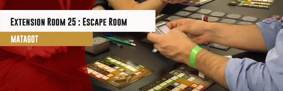 Nous sommes sur le stand de Matagot, où Mathias nous présente la future extension pour Room 25 : Escape Room.
