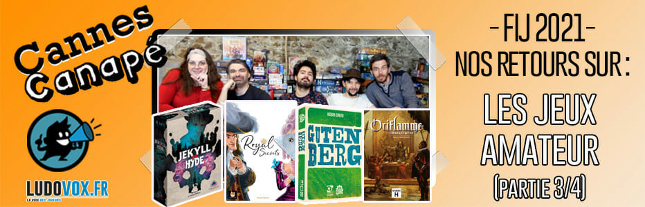 CANNES CANAPÉ – FIJ 2021- JEUX AMATEUR : Gutenberg, Jekyll VS Hyde, Oriflamme Embrasement, Royal Secrets