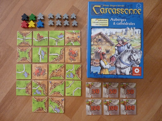 D’autre part, les cathédrales (au nombre de deux) qui s’intègrent dans les cités et portent leur valorisation à trois points. Cependant, si les routes ou cités contenant ces éléments ne sont pas complétées, elles ne rapporteront aucun point à leur propriétaire. Il y a donc une prise de risques lorsqu’un joueur décide de se positionner sur ces éléments. Bien évidemment, auberges et cathédrales (!) peuvent être insérées sur une position adversaire afin de neutraliser les points de celui-ci (mais c’est très méchant, et il ne faut pas le faire).
